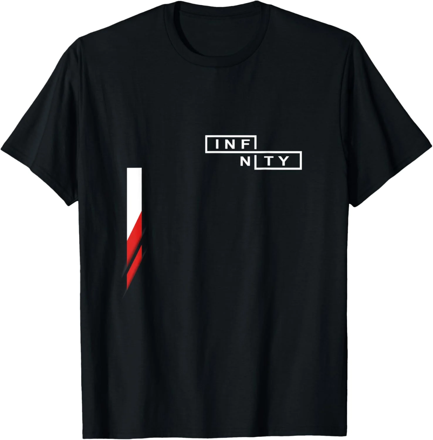 Positioned at the upper right area of the shirt is the word “INFINITY” in white. The first three letters, “INF,” are placed inside a thin rectangular frame, while the remaining three letters, “NITY,” sit within another thin rectangular frame. This separation creates a sense of balance and structure.