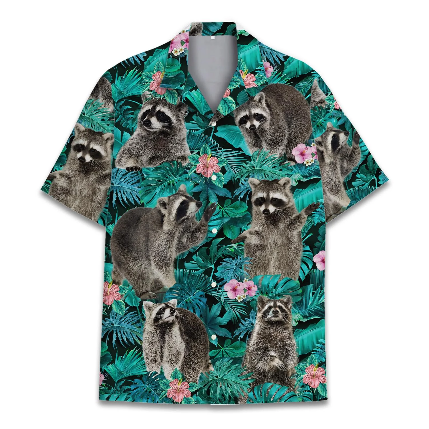 The shirt stands out with an adorable Raccoon pattern woven into a lush tropical jungle. The design features dominant Green/Emerald tones from various tropical leaves and plants, accented with vibrant pink hibiscus flowers and small butterflies, all set against a contrasting Black fabric background. This design delivers a wild, tropical, and stylish aesthetic.