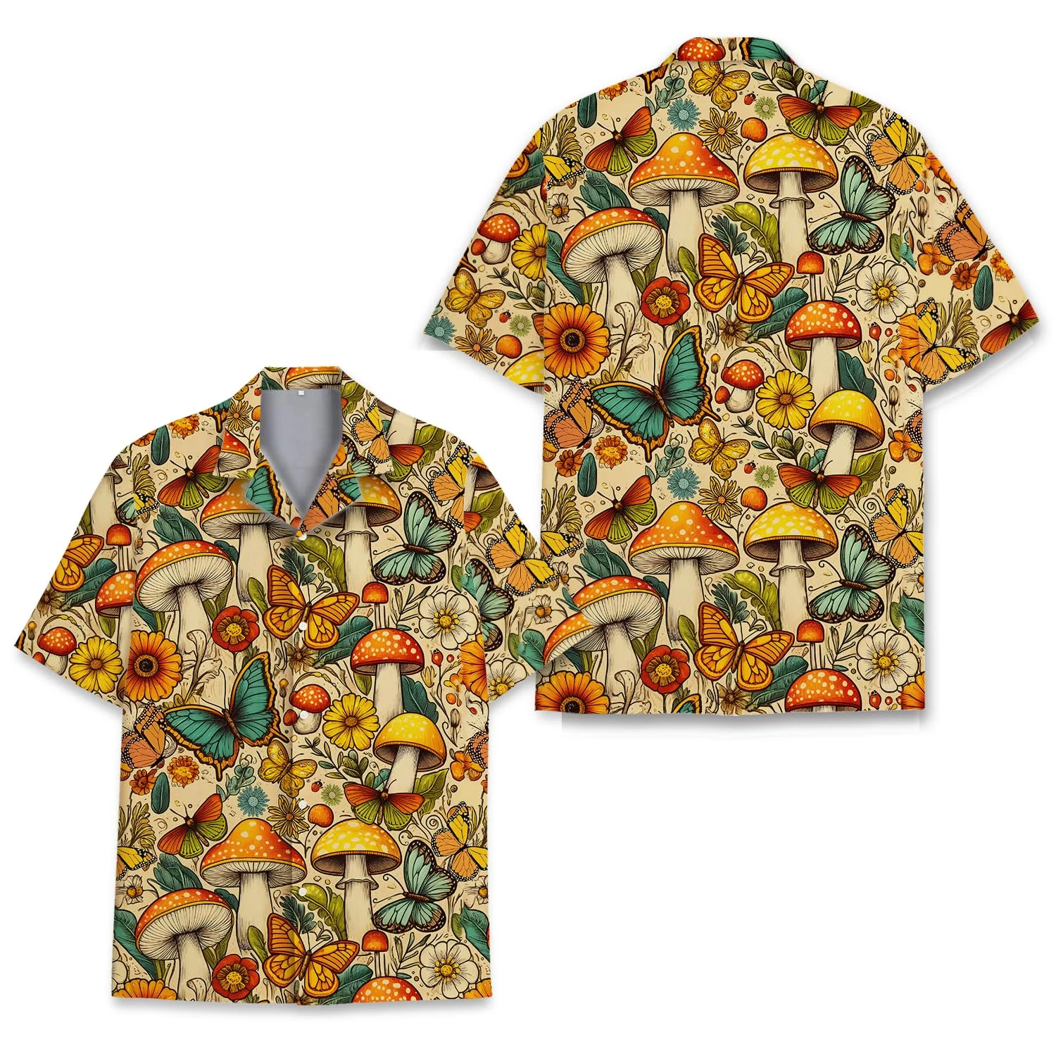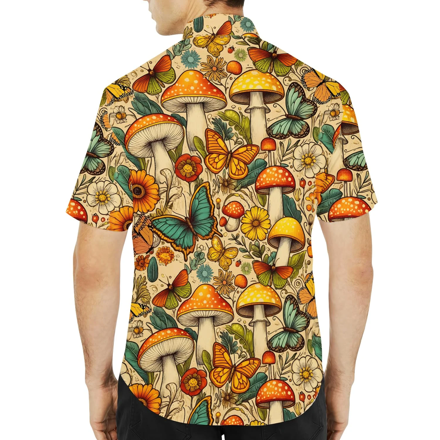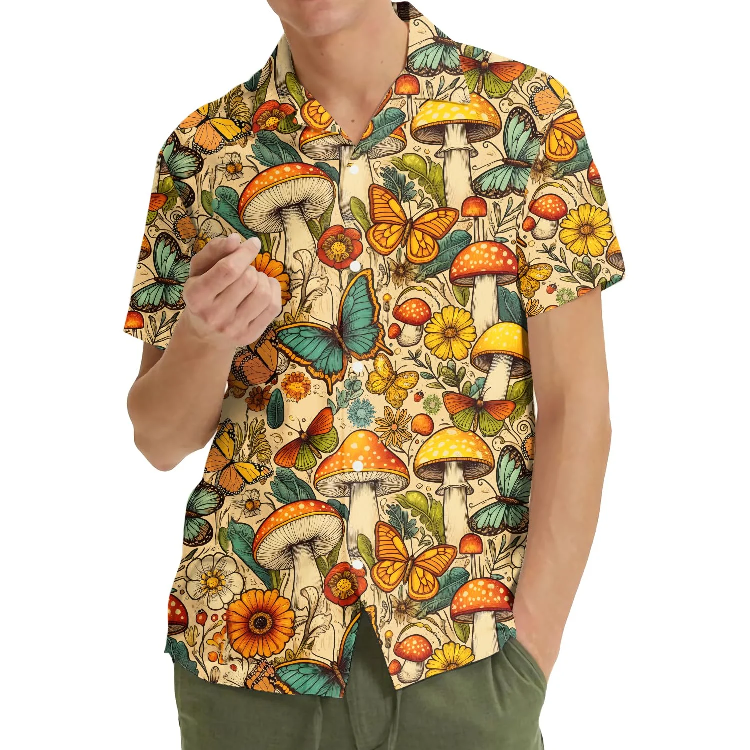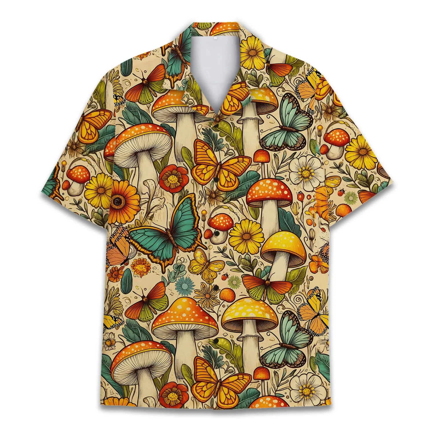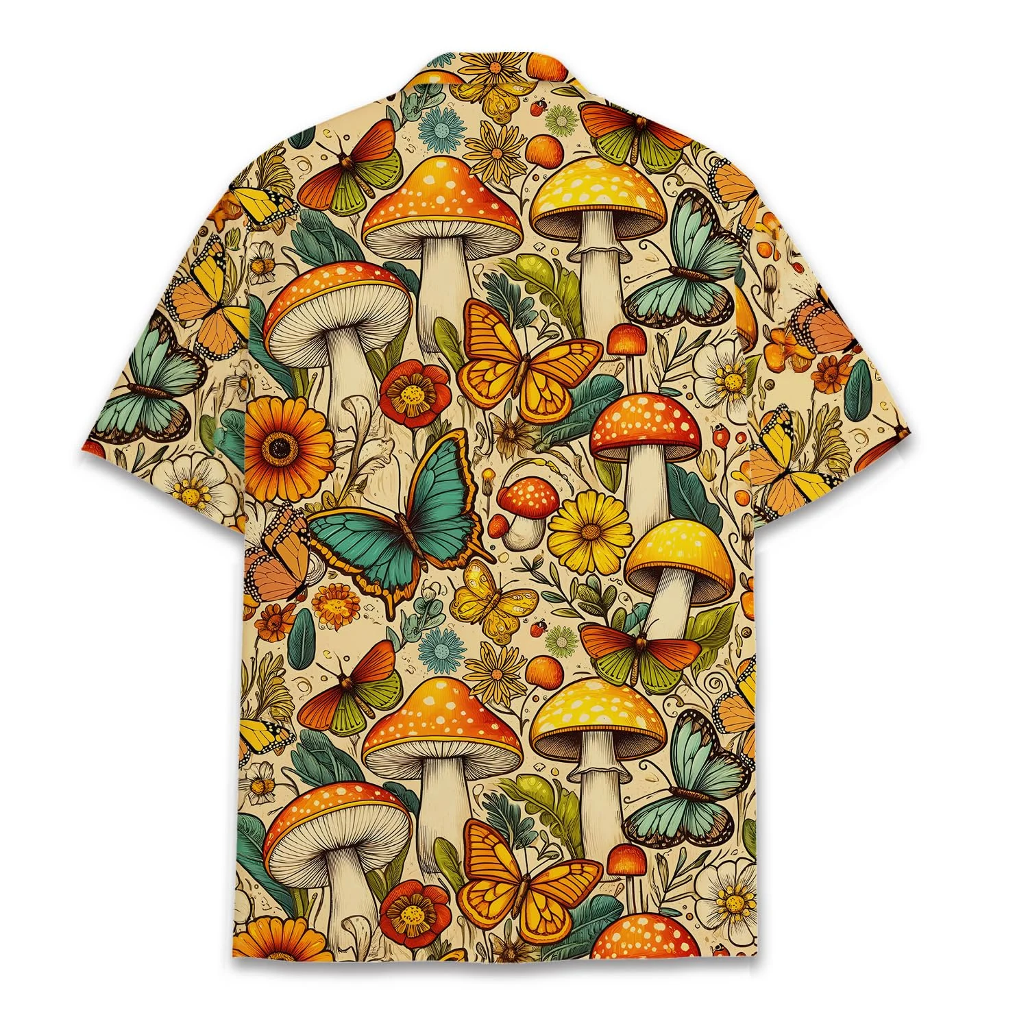 The shirt stands out with a Vintage/Cottagecore-inspired pattern featuring mushrooms, butterflies, and floral elements. The dense design includes multicolored mushrooms (mainly orange and yellow), teal and yellow butterflies, along with daisy flowers and green leaves. The Light Beige background creates a warm, classic feel. This design brings a nostalgic, gentle, and nature-inspired aesthetic.