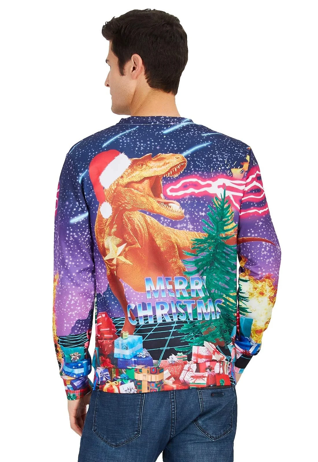 Action: The Dinosaur is breathing fire onto a lush green Christmas Tree, creating a scene that is both startling and humorous. In the distance, a large, fiery explosion adds drama to the setting.