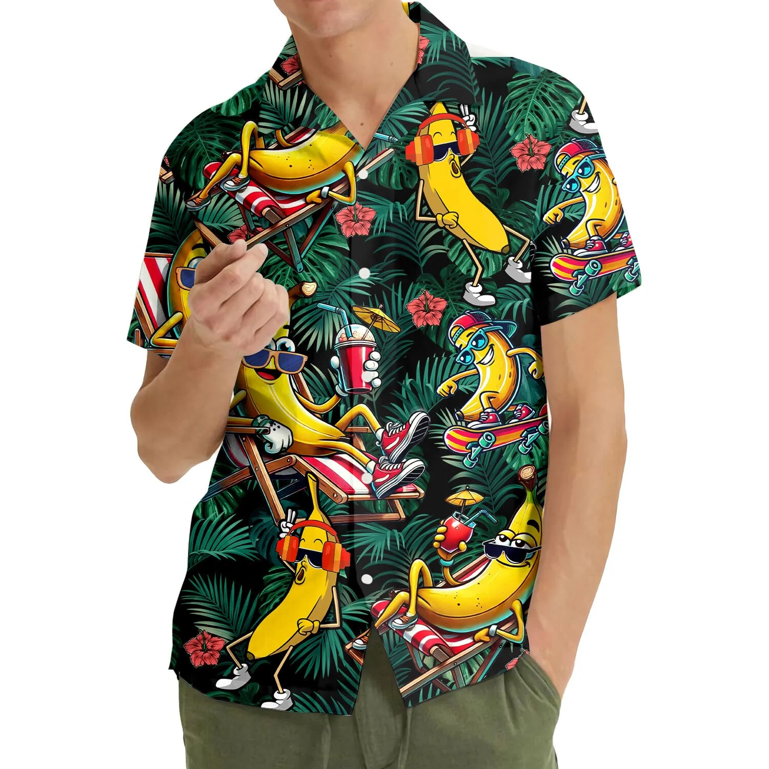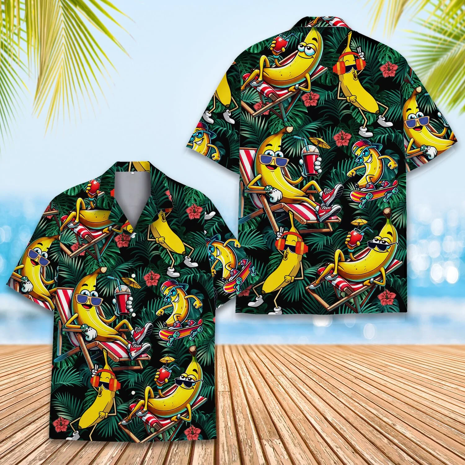 The shirt stands out with a Fun Cartoon Banana pattern on a Black fabric background featuring dense tropical elements. The design depicts cartoon bananas enjoying a vacation: relaxing on a beach chair, skateboarding, wearing headphones, and sipping drinks. The combination of deep green palm leaves and the bright yellow “banana characters” creates a unique, humorous style full of summer energy.