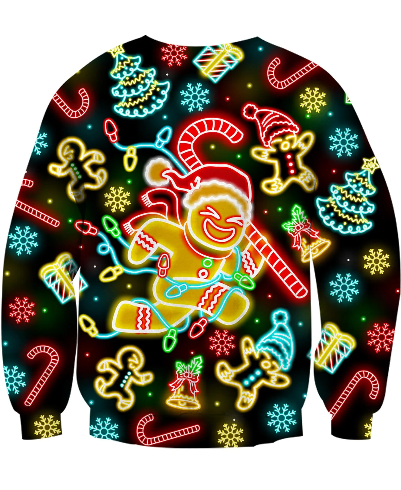Supporting Elements: Surrounding the main character are traditional holiday motifs, including neon green Christmas trees, neon red candy canes, neon blue snowflakes, and smaller glowing gingerbread men.