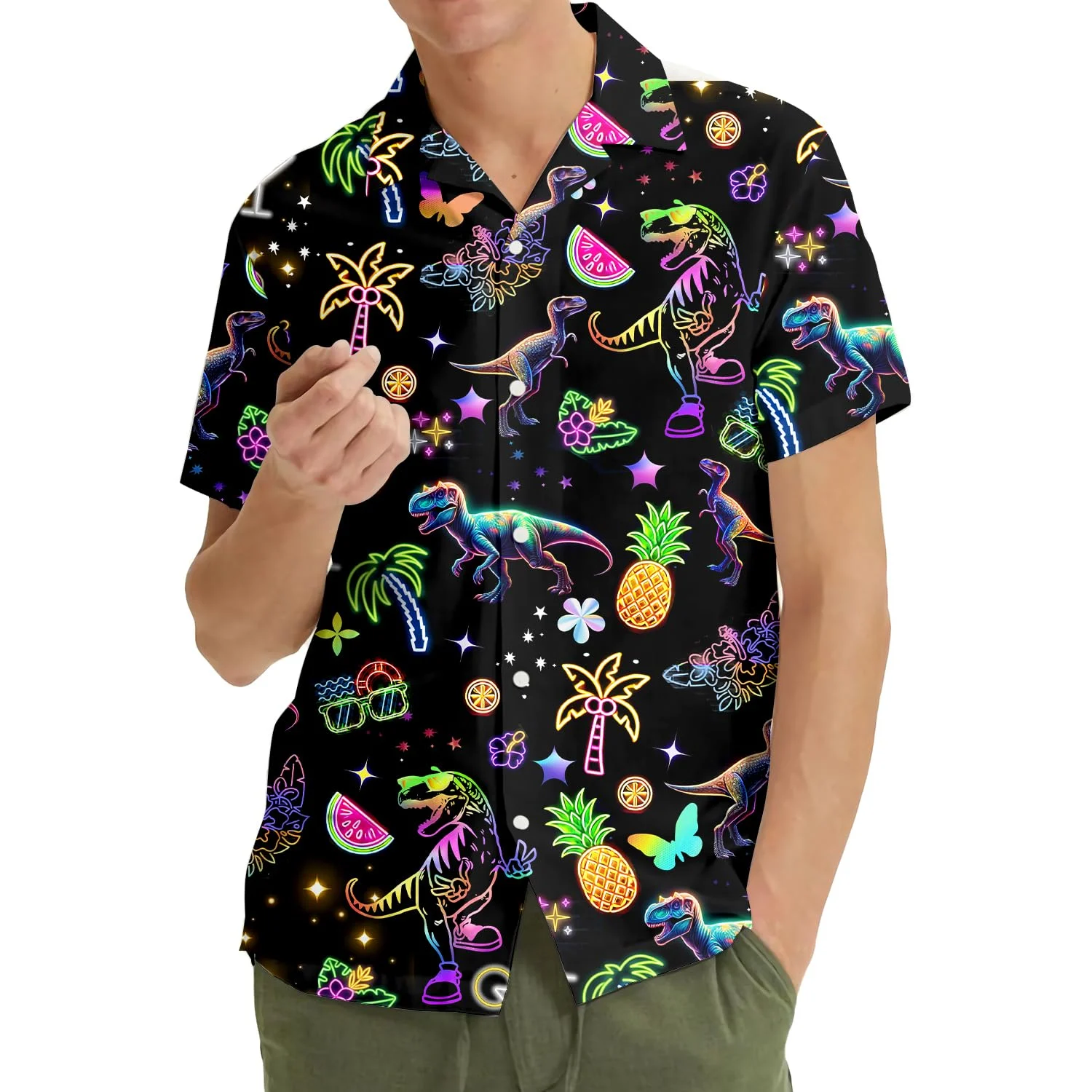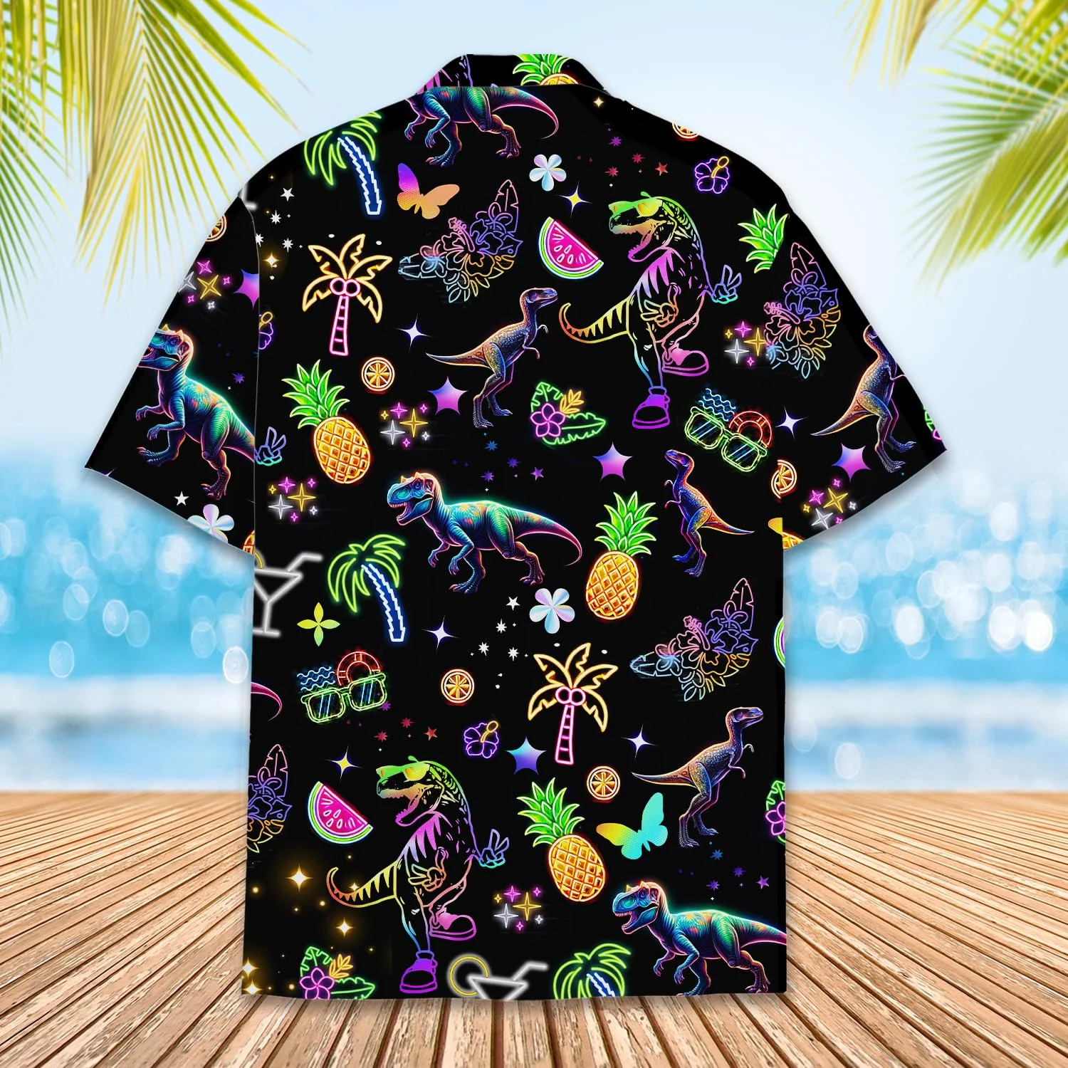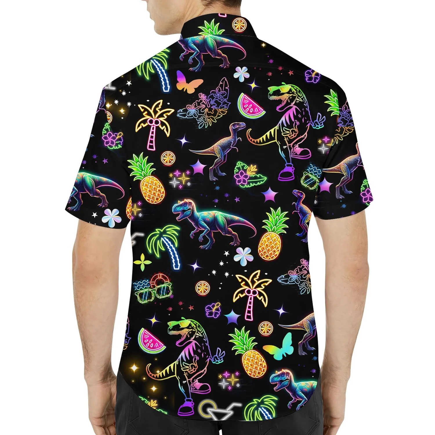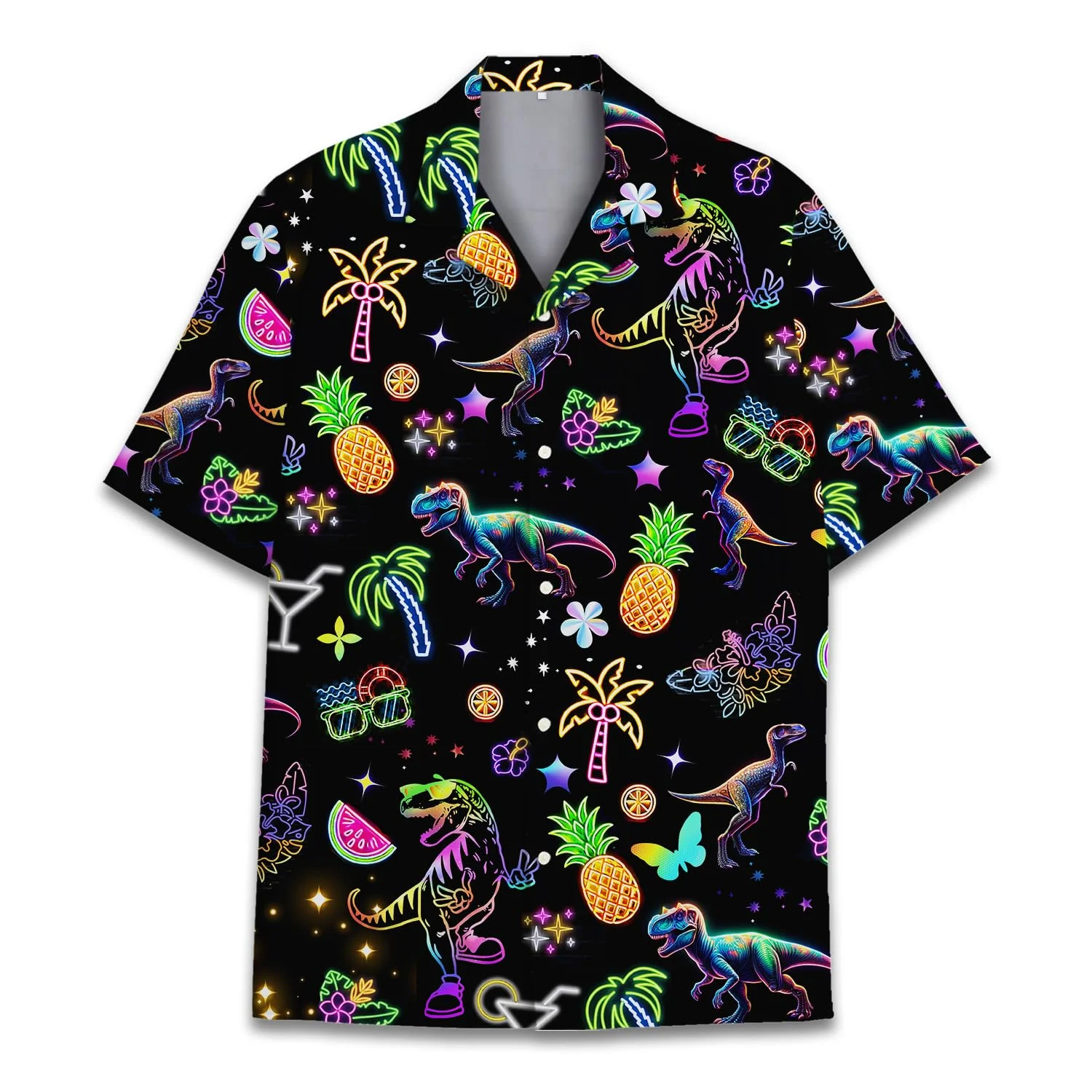 The shirt stands out with a vibrant Neon-Effect Dinosaur and Tropical Trees pattern on a deep Black fabric background. The design features T-Rex dinosaurs, palm trees, pineapples, watermelon slices, cocktails, and stylized stars outlined with glowing neon gradients (pink, green, purple, blue). This design delivers a Retro/Party vibe that is unique and extremely eye-catching in the dark or under night lights.