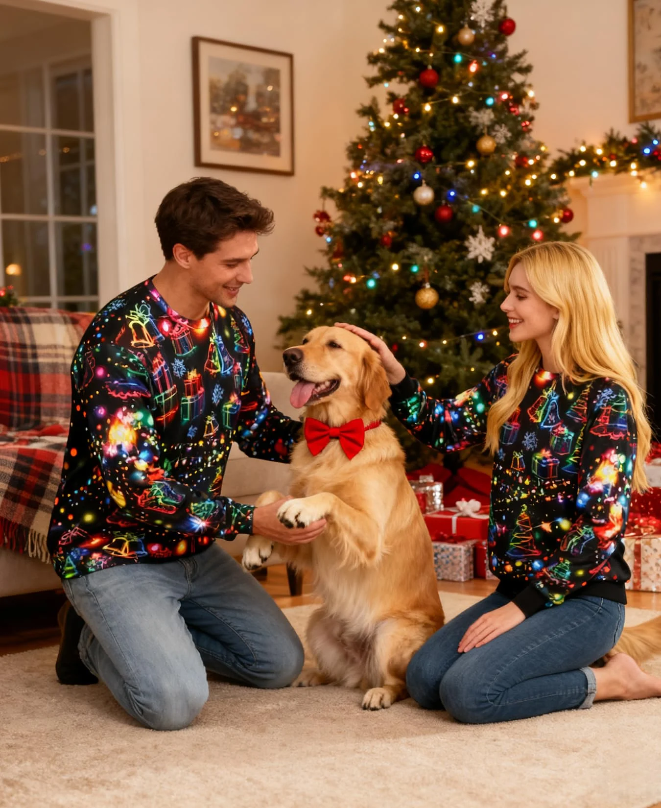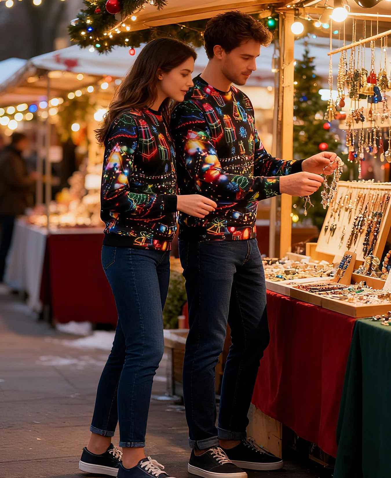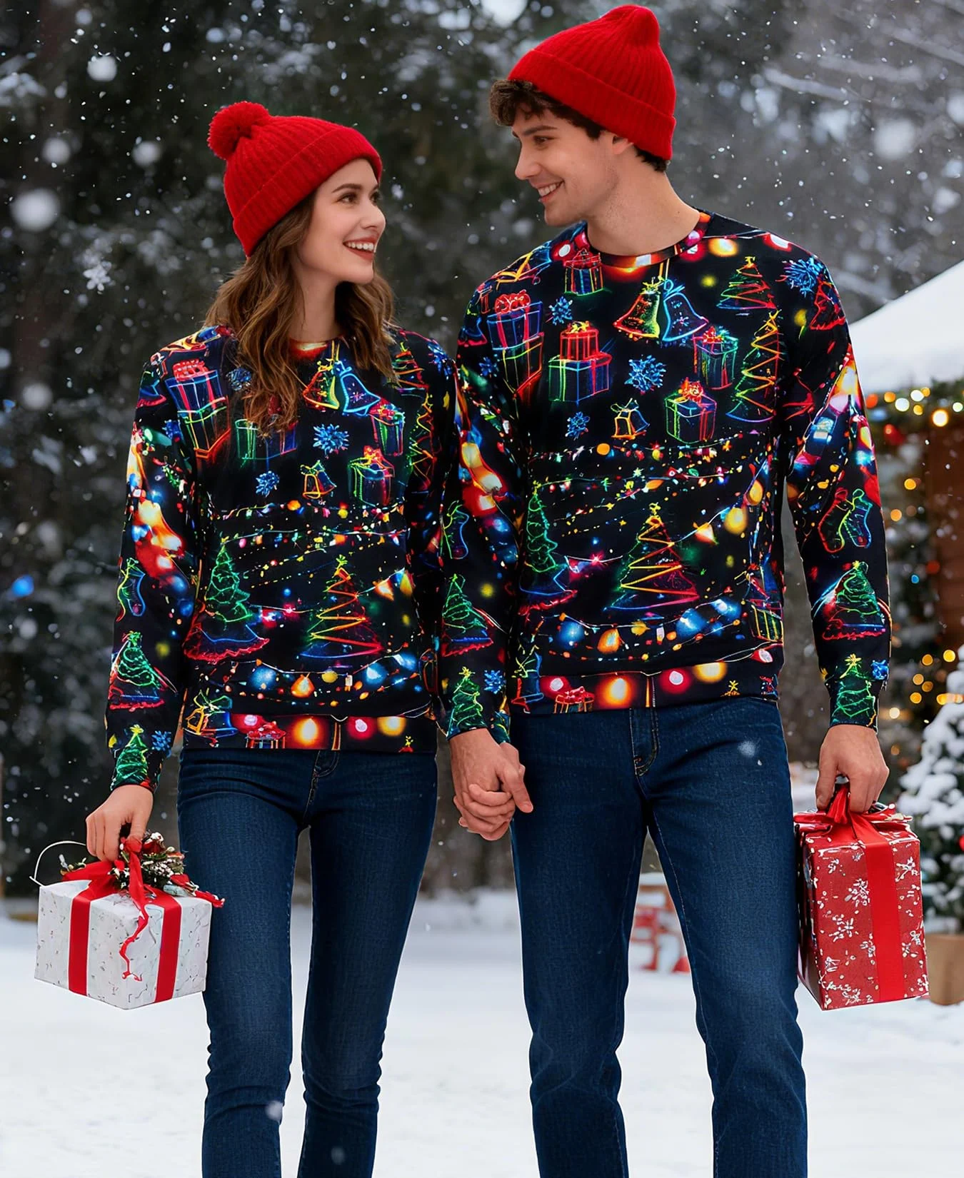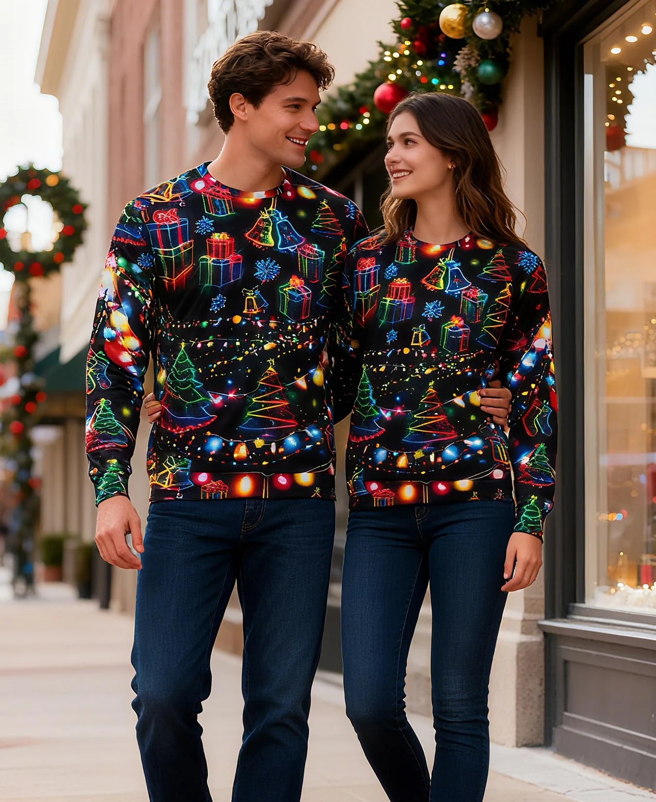 Bring the festive spirit home with this Christmas sweatshirt! Featuring vibrant 3D neon-style designs on a black background, this sweater is sure to make you stand out at any end-of-year party.
